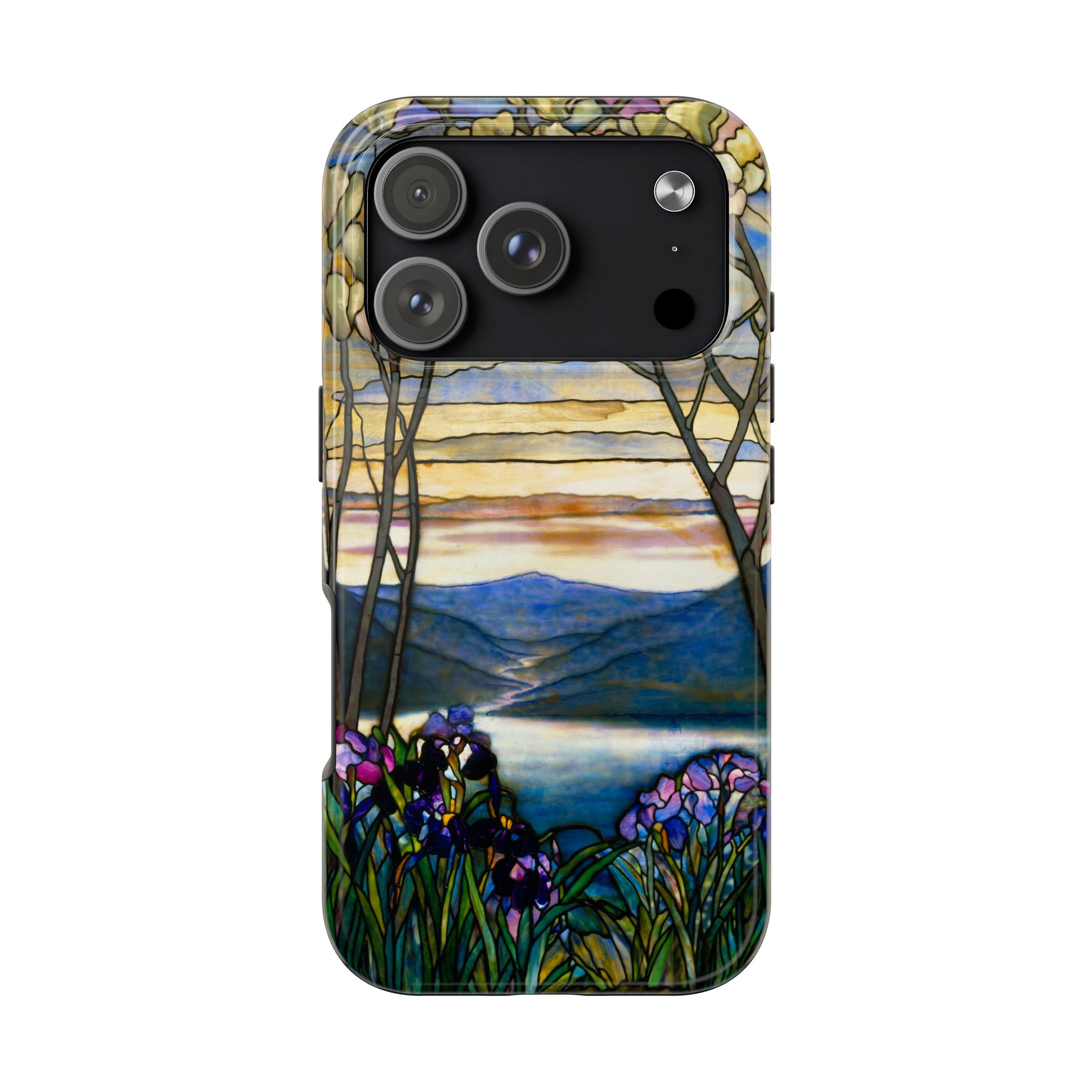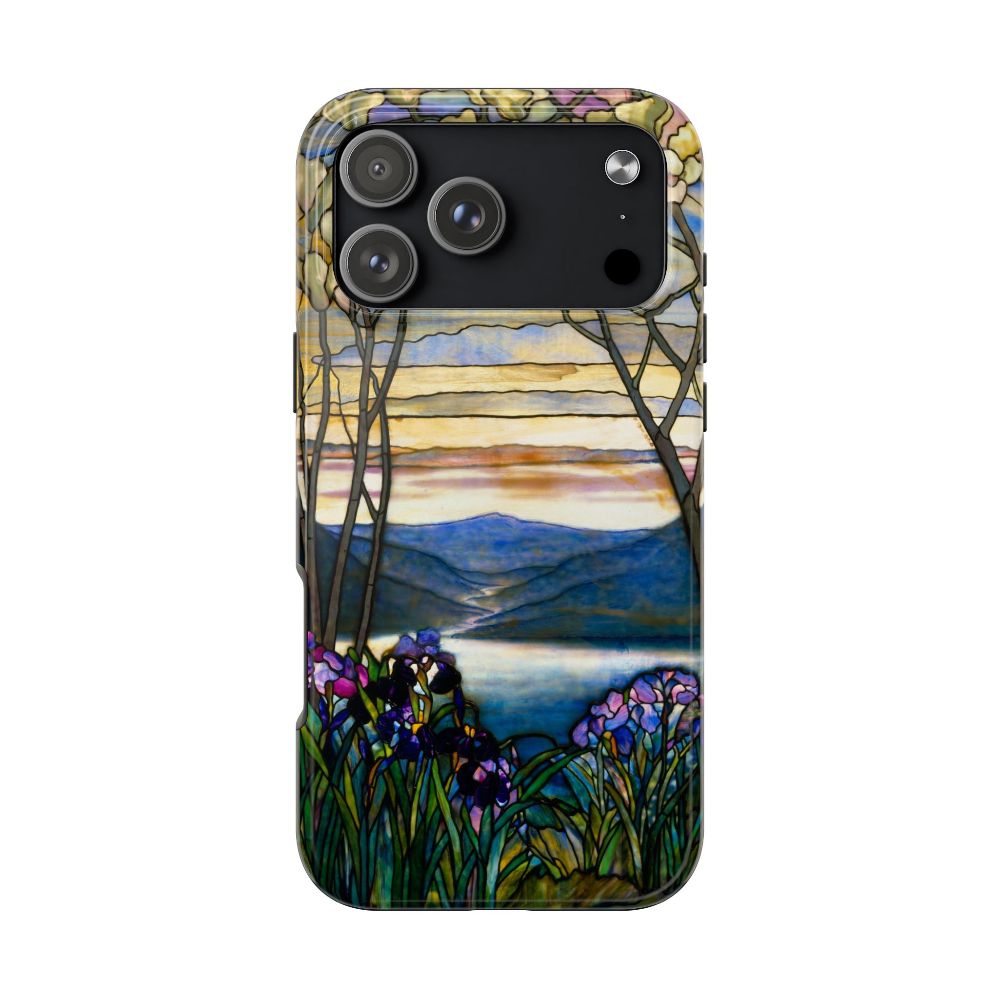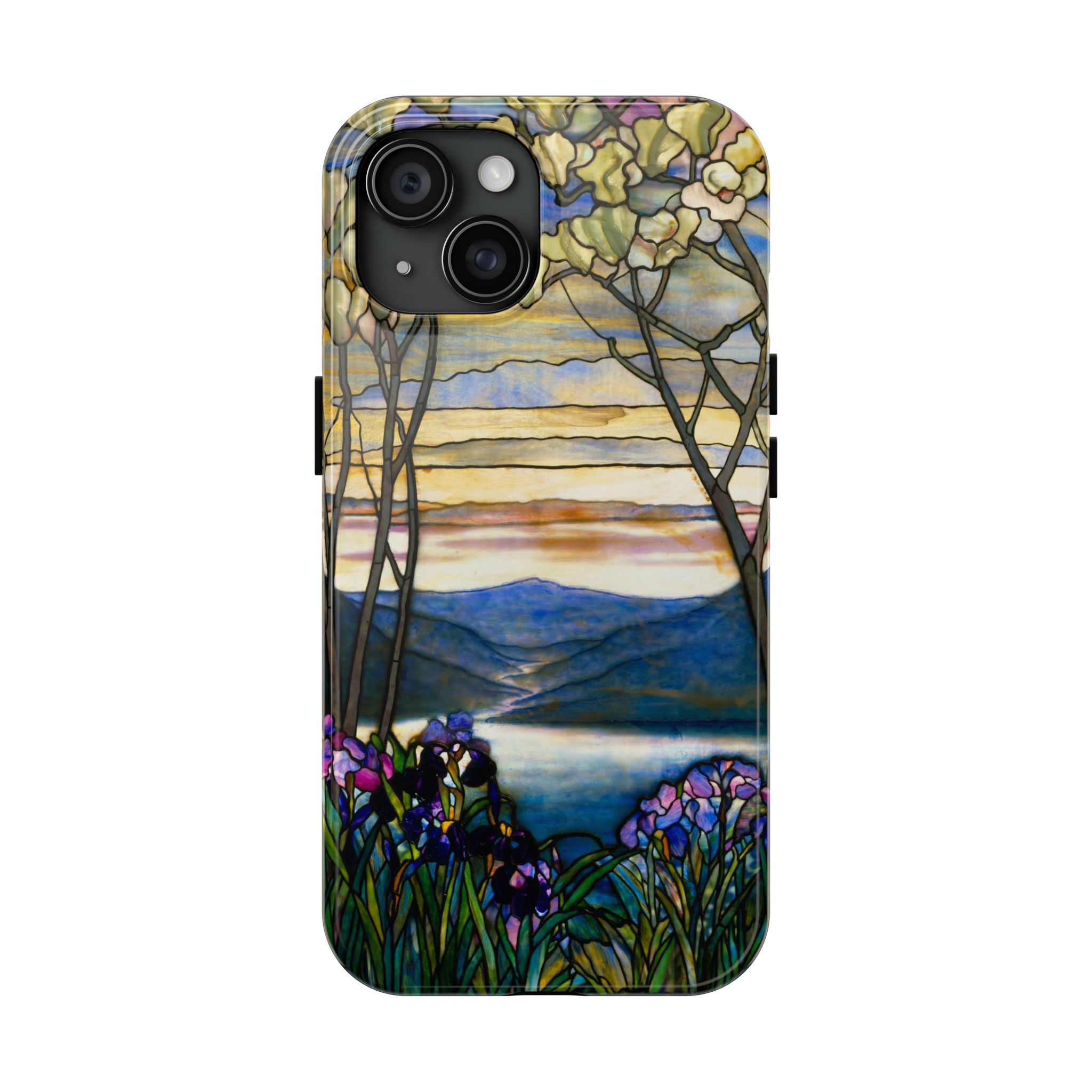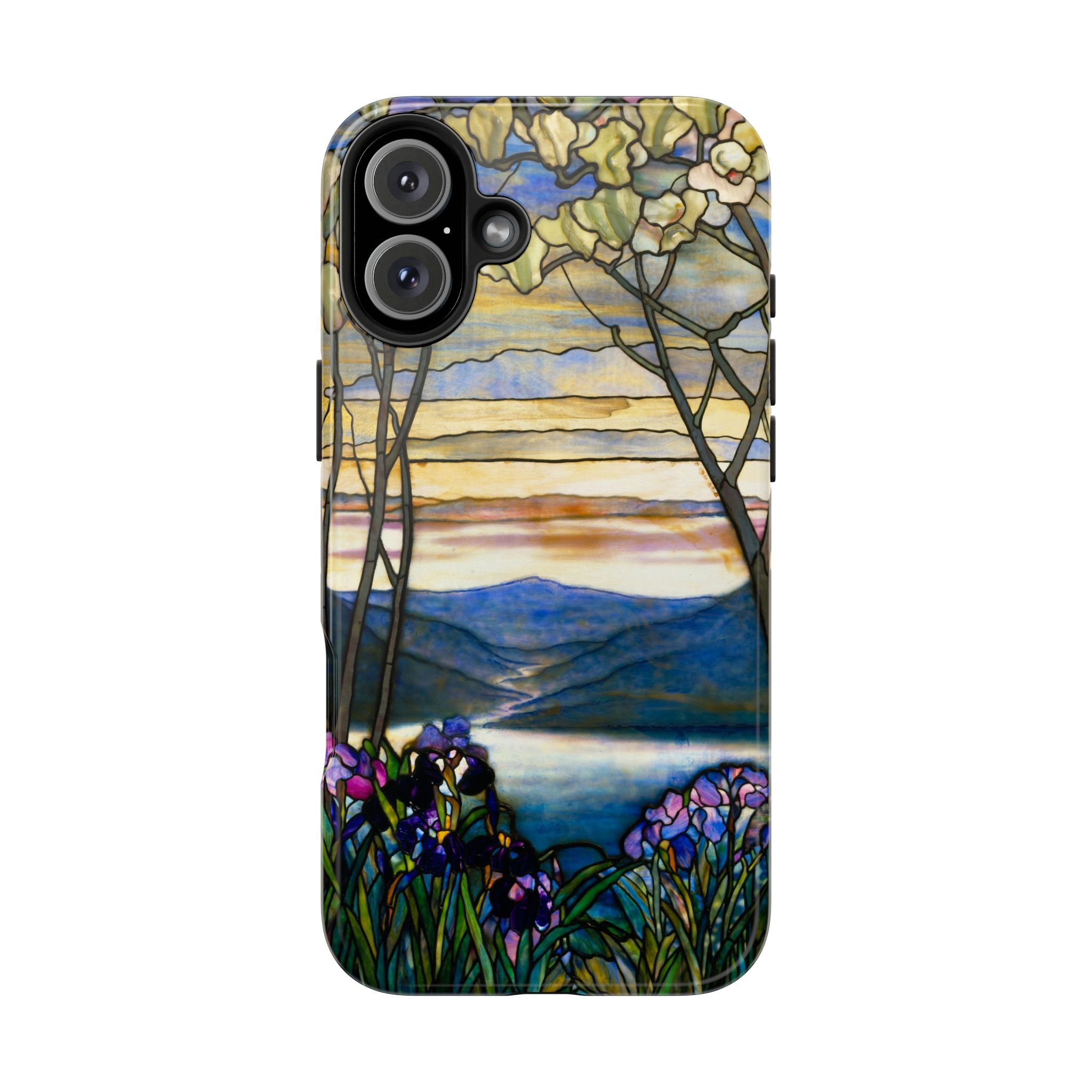 A slim, protective phone case that brings a stained-glass landscape of Louis Comfort Tiffany to your daily life. The scene—soft sunrise over distant mountains, glassy water, and foreground irises—wraps the case in painterly color and quiet, early morning calm. The hard polycarbonate shell and flexible TPU liner of the case form a two-piece protection system for your phone that diffuses shocks and the screen-side bezel guards screen if you lay your phone down upside down. Glossy, UV-protected printing preserves the artwork’s depth and keeps colors vibrant when you use your phone outside. This case enhances the lives of people who cherish artful details and turns routine phone checks into small moments of beauty.