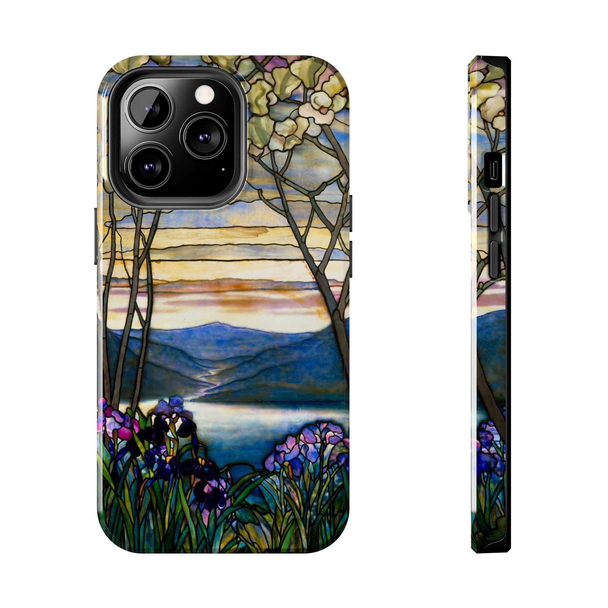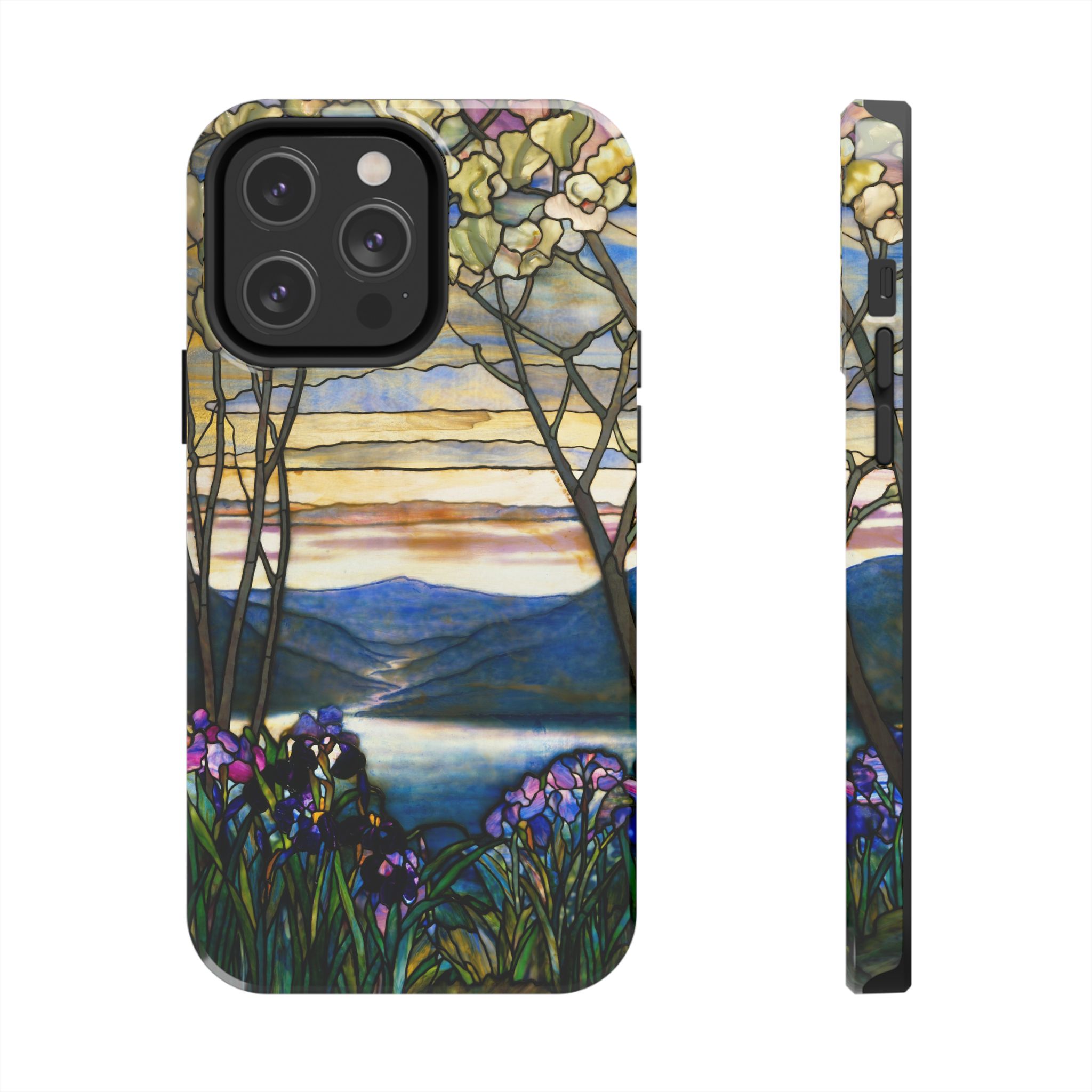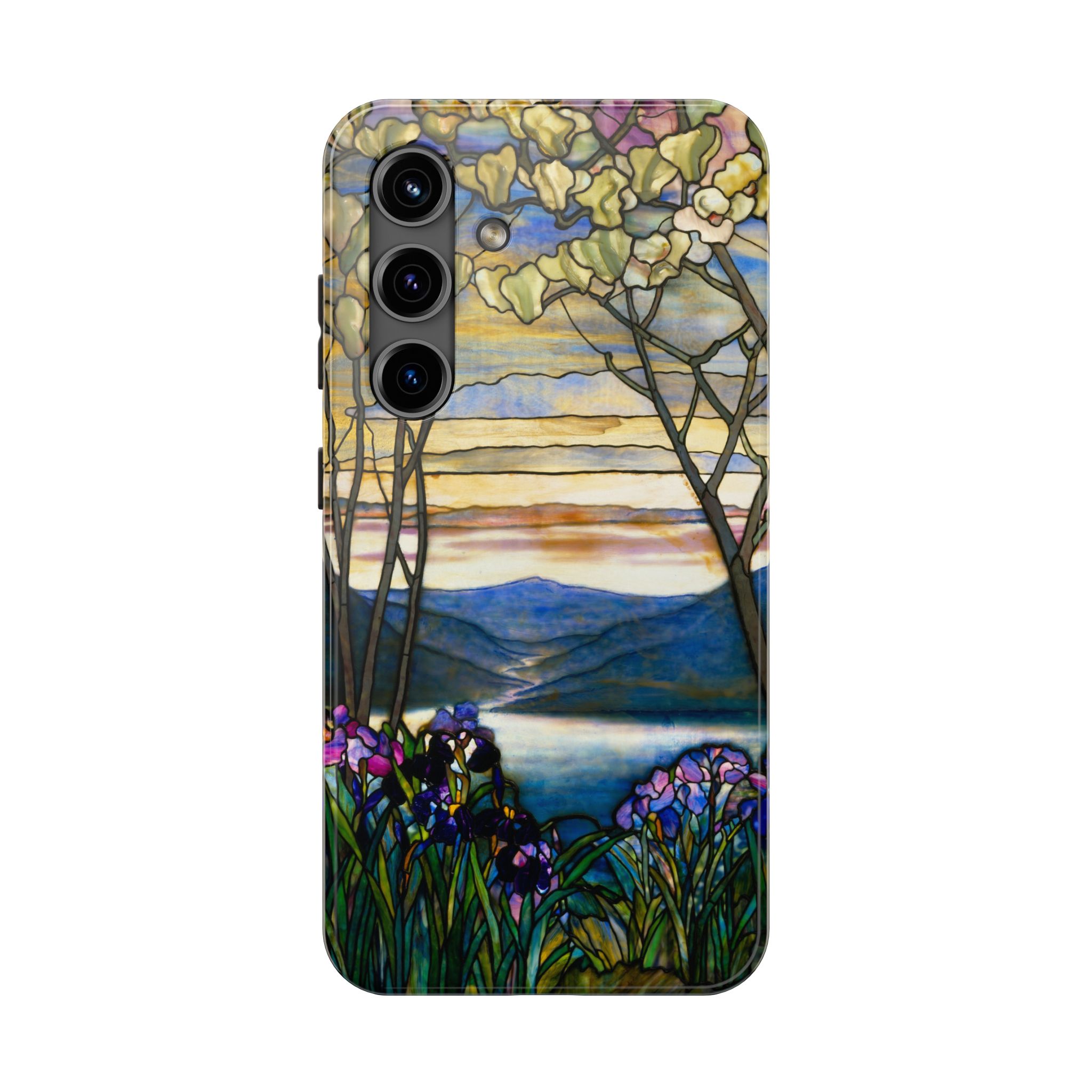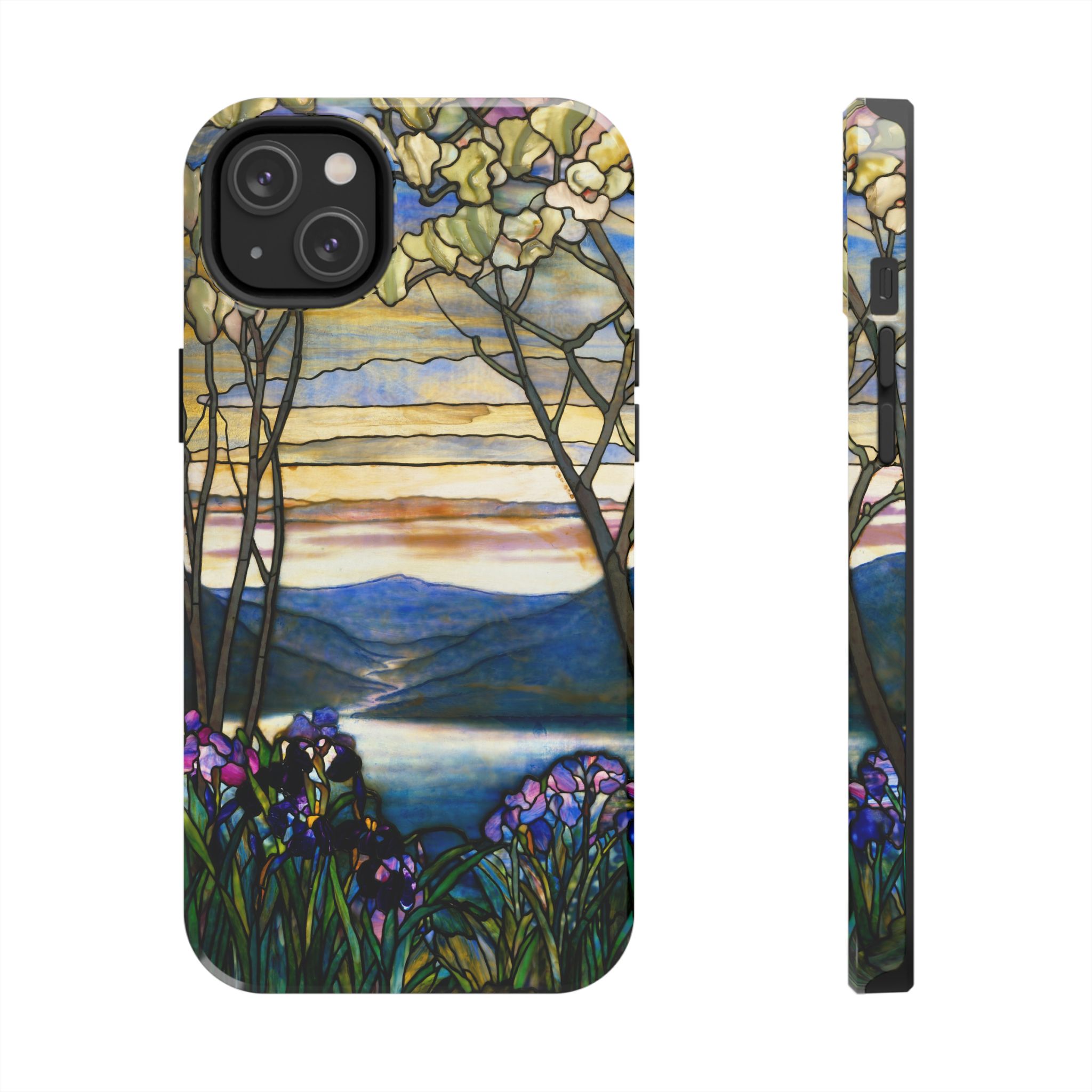 A slim, protective phone case that brings a stained-glass landscape of Louis Comfort Tiffany to your daily life. The scene—soft sunrise over distant mountains, glassy water, and foreground irises—wraps the case in painterly color and quiet, early morning calm. The hard polycarbonate shell and flexible TPU liner of the case form a two-piece protection system for your phone that diffuses shocks and the screen-side bezel guards screen if you lay your phone down upside down. Glossy, UV-protected printing preserves the artwork’s depth and keeps colors vibrant when you use your phone outside. This case enhances the lives of people who cherish artful details and turns routine phone checks into small moments of beauty.